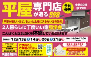 お2人様向け2LDK平屋完成見学会!12月13日より瑞浪市穂並にて開催!